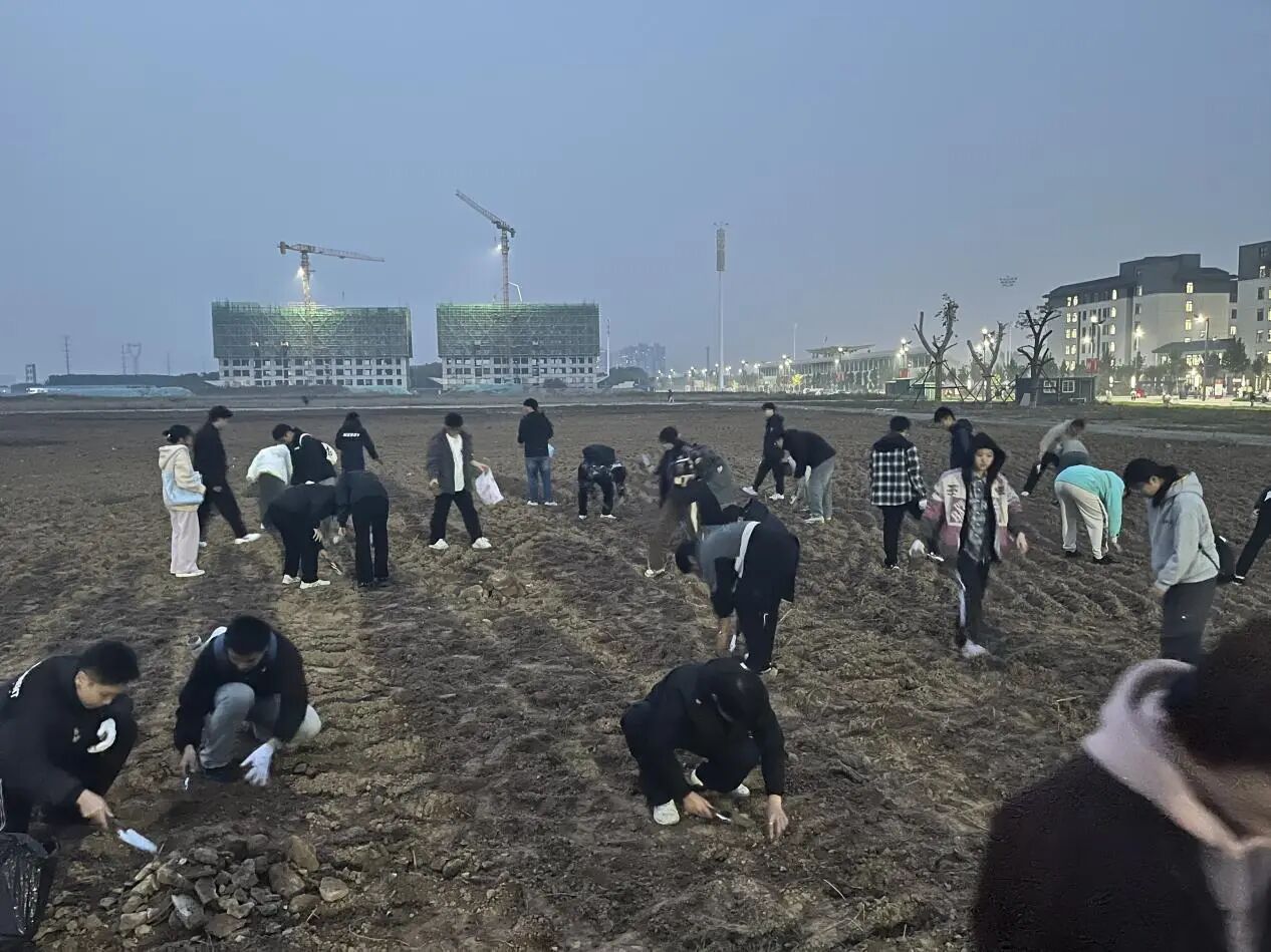劳动现场,学院领导与辅导员老师们带头行动。学生入党积极分子们也迅速投入参与清理劳动区石块的工作。