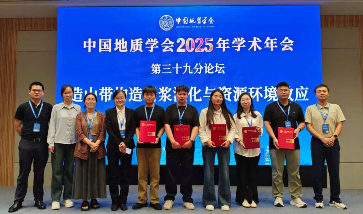 研究生学术交流同样成果丰硕。邱晶、鲍喆在第5专题汇报了山东地区金及多金属矿床成矿机制研究成果;王盛鑫在第7专题介绍了西昆仑大红柳滩锂矿田构造与找矿信息提取进展;在第39专题中,宋珈璐、邢天娇、康鹏分别围绕斑岩钼矿成矿过程、火山-侵入岩成因及壳幔作用等作了报告;朱伊冰、郭子桤、温雨菁三位同学在第44专题中展示了冀南、太行山等地区火成岩成因矿物学与矿床成因研究。经大会评选,我校研究生温雨菁、邱晶、邢天娇、郭子桤、朱伊冰、鲍喆、康鹏获“优秀论文摘要奖”,宋珈璐获评“分会场优秀报告”,充分展现了我校研究生的学术风采。