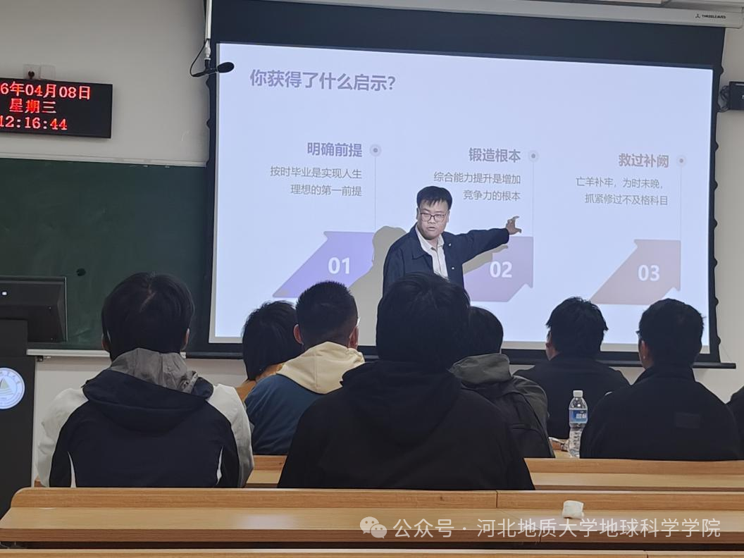 2026年4月8日,地球科学学院面向2024级全体学生召开“勤学筑基,不负地质韶华”学风建设主题班会。会议由辅导员张月婷、郭宇明主持,围绕学生成长关键阶段,系统梳理学业发展、毕业升学与就业前景等重要议题,全面布置班级学业帮扶工作,引导学生夯实学风、提升自我,积极投身学院建设。